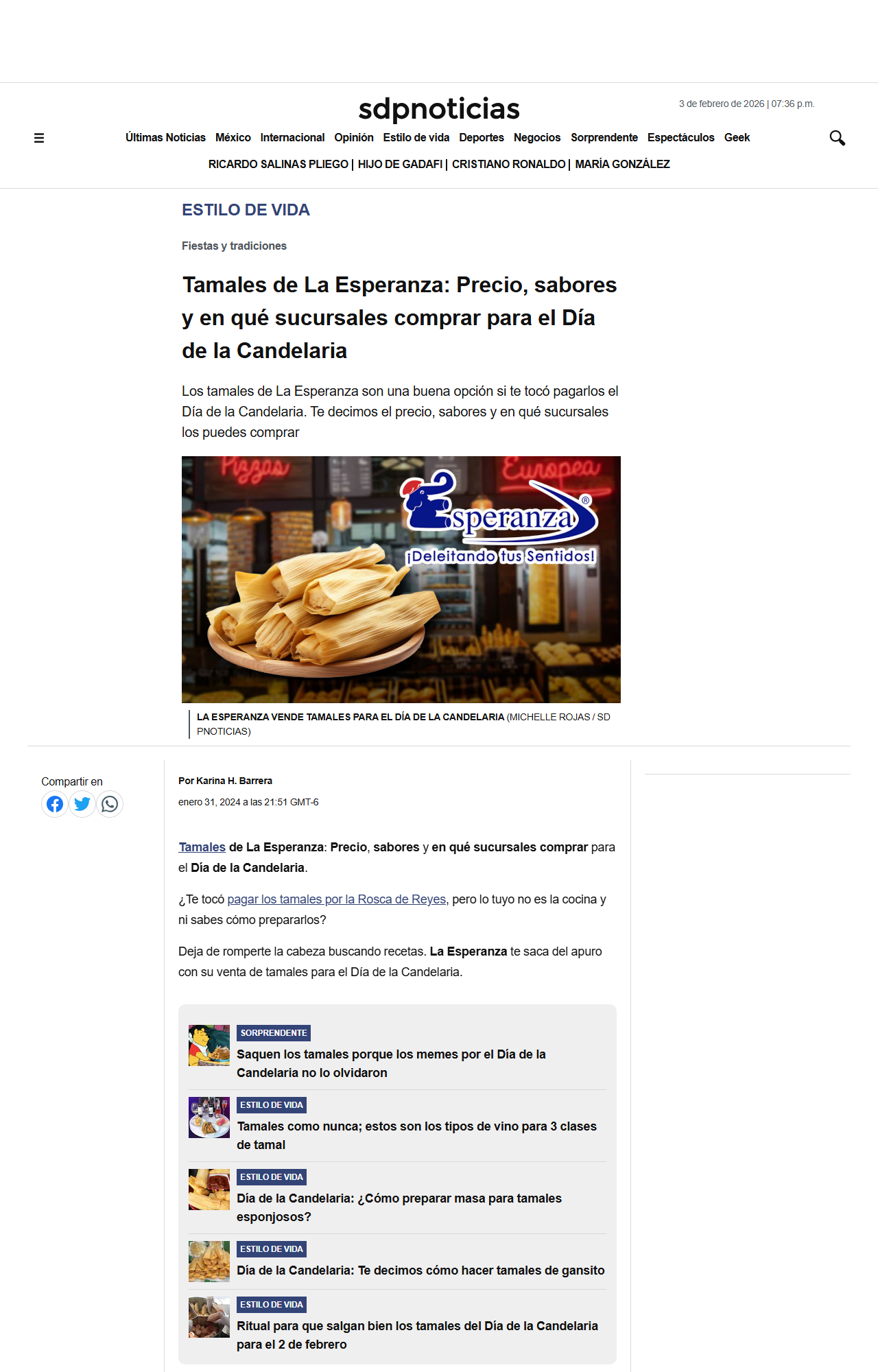 Cabe señalar que La Esperanza vende tamales en las mencionadas sucursales desde hace tiempo, por lo que no sólo estarán a la venta el Día de la Candelaria.